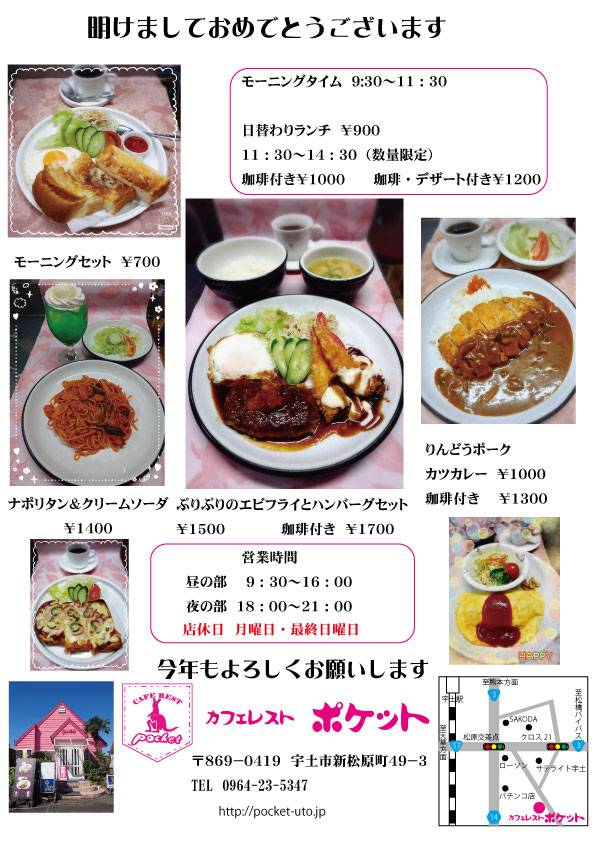 明けましておめでとうございます 2026年1月4日(日)から[定休:月曜日、最終日曜日]<<<カフェレスト ポケット>>>元気に営業してまいります!